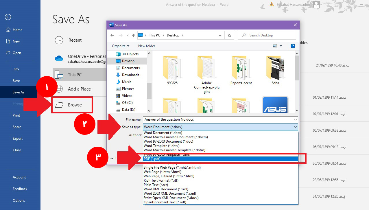 سپس با استفاده از Browse محل ذخیره فایل pdf خود در ویندوز را انتخاب کنید و مانند شکل عمل نمایید.