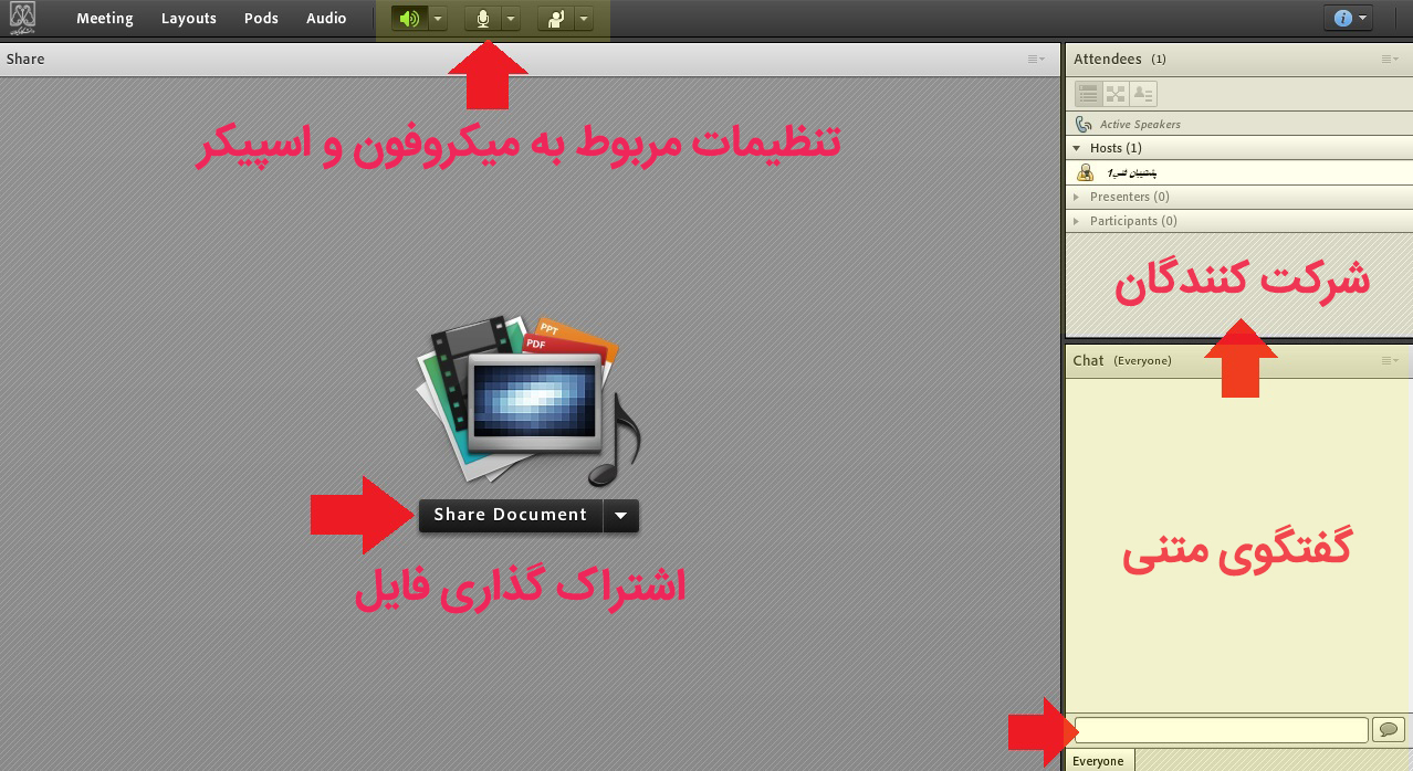 اجزای یک کلاس آنلاین:Attendees (شرکت کنندگان) Host: میزبان، مدیر یک کلاس آنلاین است. مدیران کلاس آنلاین، استادان و پشتیبانی فنی هستند. Presenter: ارائه دهندگان در کلاس آنلاین را شامل میشود. افرادی که دارای نقش Presenter هستند میتوانند فایل بارگذاری نمایند. Participant: افراد شرکت کننده در کلاس آنلاین هستند که در صورتی که Host به این افراد اجازه دهد، میتوانند در وبینار صحبت کنند. به طور کلی این دسته تنها میتوانند شنونده و بیننده باشند. به طور کلی دانشجویان، در این سطح قرار خواهند گرفت. به شکل زیر توجه نمایید. آیکونها از سمت راست به چپ Raise Hand: این گزینه برای اجازه گرفتن فعال کردن میکروفون است. افرادی که در سطح Participant هستند با کلیک بر روی این گزینه از استاد درخواست فعال کردن میکروفون مینمایند. استاد با مشاهده پیام، در صورت تایید (انتخاب تیک) گزینه میکروفون ایشان را فعال مینماید (آیکون وسط نمایش داده میشود.) Microphone: این گزینه برای Host و Presenter فعال است. با کلیک بر روی این آیکون، میکروفون شما فعال خواهد شد. توجه نمایید که حتما سیستم شما باید دارای میکروفون باشد و تنظیمات میکروفون را به درستی انجام داده باشید. (راهنمایی در خصوص تنظیمات میکروفون در ویندوز) افراد در سطح Participant با انتخاب گزینه Raise Hand و سپس تایید استاد نیز به این گزینه دسترسی پیدا خواهند کرد. با کلیک بر روی Drop Down (مثلث رو به پایین) گزینه های دیگری را مشاهده خواهید نمود. گزینه اول و دوم، برای غیرفعال کردن میکروفون در کلاس آنلاین به طور موقت و گزینه سوم مربوط به تنظیمات میکروفون و افزایش Microphone Level است. Speaker: رنگ سبز به معنی فعال بودن اسپیکر است و صدای سخنرانان را خواهید شنید. بارگذاری فایل بارگذاری فایل توسط host و presenter صورت میپذیرد. در صورتی که فایل ارائه شما به فارسی است، حتما آن را به pdf تبدیل نمایید و سپس بارگذاری نمایید.
